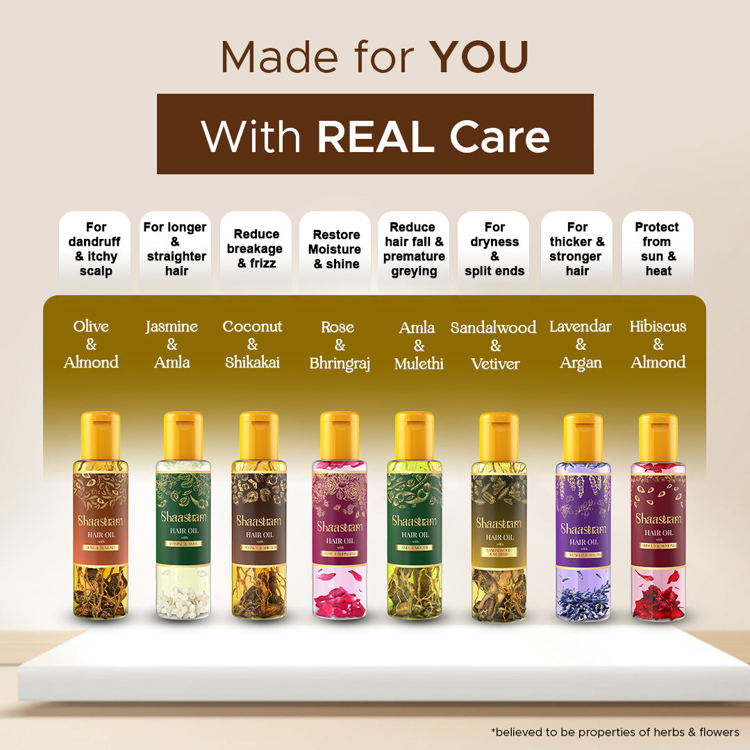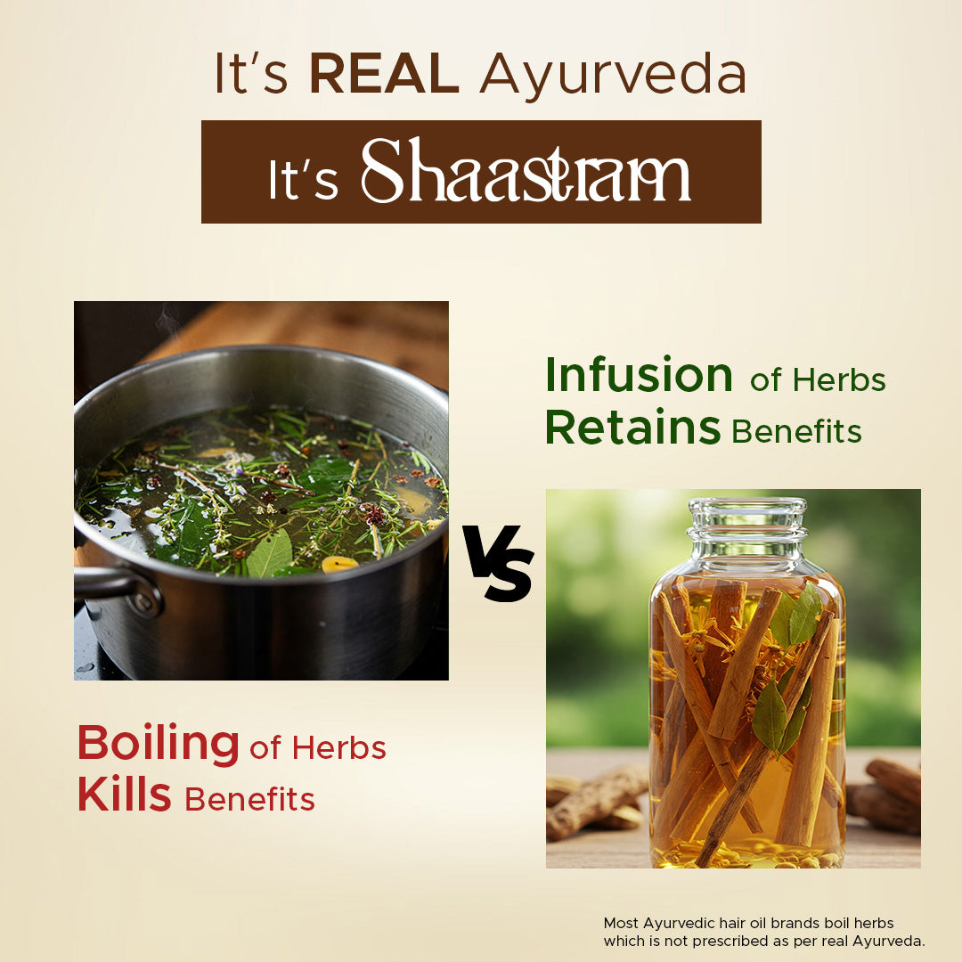 Shaastram's Coconut & Shikakai Herbal Hair Oil is rooted in centuries-old wisdom combining the cleansing properties of Shikakai with the deep nourishment of Coconut oil. Shikakai, often called "fruit for the hair" in Ayurveda, helps gently clear scalp buildup, reduce dandruff, and improve follicle strength. Coconut oil penetrates deep into the hair shaft, preventing protein loss and dryness. Together, this herbal blend detoxes, nourishes, and revives dull, tired hair – all while being lightweight and non-sticky. With real visible herbs and a 3-year shelf life, it's modern Ayurveda made simple.