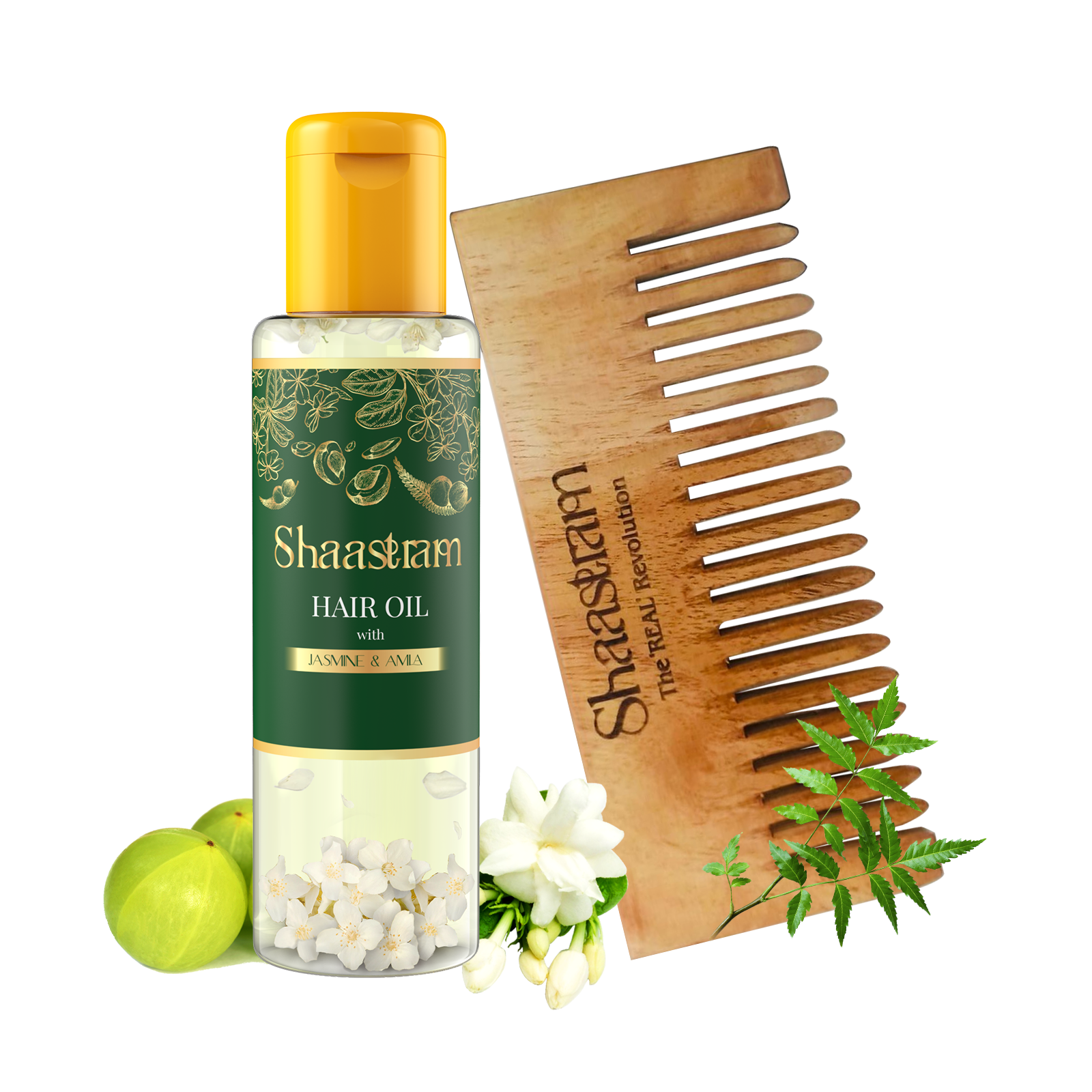 Relax your mind and rejuvenate your hair with Shaastram Jasmine & Amla Herbal Hair Oil, infused with real herbs and flowers. The calming fragrance of Jasmine soothes stress while Amla strengthens roots, reduces hair fall, and promotes natural shine. Paired with a Pure Neem Comb, the combo ensures even oil distribution, gently massages the scalp, and stimulates circulation for healthier, more resilient hair. Jasmine uplifts the senses while Amla nourishes strands, leaving hair soft, smooth, and vibrant. Lightweight and non-sticky, this oil transforms your hair care routine into a relaxing ritual, helping reduce stress, strengthen hair, and leave strands naturally soft, shiny, and full of vitality.