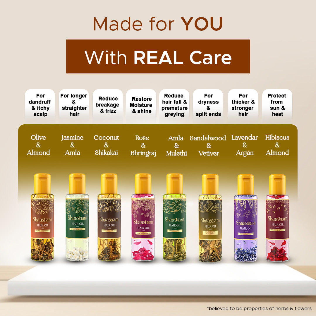 Indulge in the goodness of Ayurveda with Shaastram Olive Almond Herbal Hair Oil, infused with real herbs and flowers. This luxurious blend of Olive Oil and Almond Oil deeply nourishes your scalp, strengthens roots, and restores natural shine. Crafted through traditional slow-infusion, it helps reduce breakage dryness, and frizz while leaving hair soft, smooth, and radiant. Paired with a Pure Neem Comb, known for its antibacterial properties, this combo completes your holistic hair care ritual — improving scalp circulation, reducing dandruff, and ensuring even oil distribution. Lightweight, non-sticky, and no harsh chemicals, Shaastram Olive Almond Herbal Hair Oil is free from parabens, and silicones - offering the perfect balance of ancient wisdom and modern nourishment for strong, healthy, and beautiful hair.